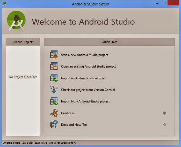 The main Android Studio IDE will then appear (see figure below). Notice that at the bottom of the windows is a message 'Check for updates now' - click on the 'Check' term to start the check.